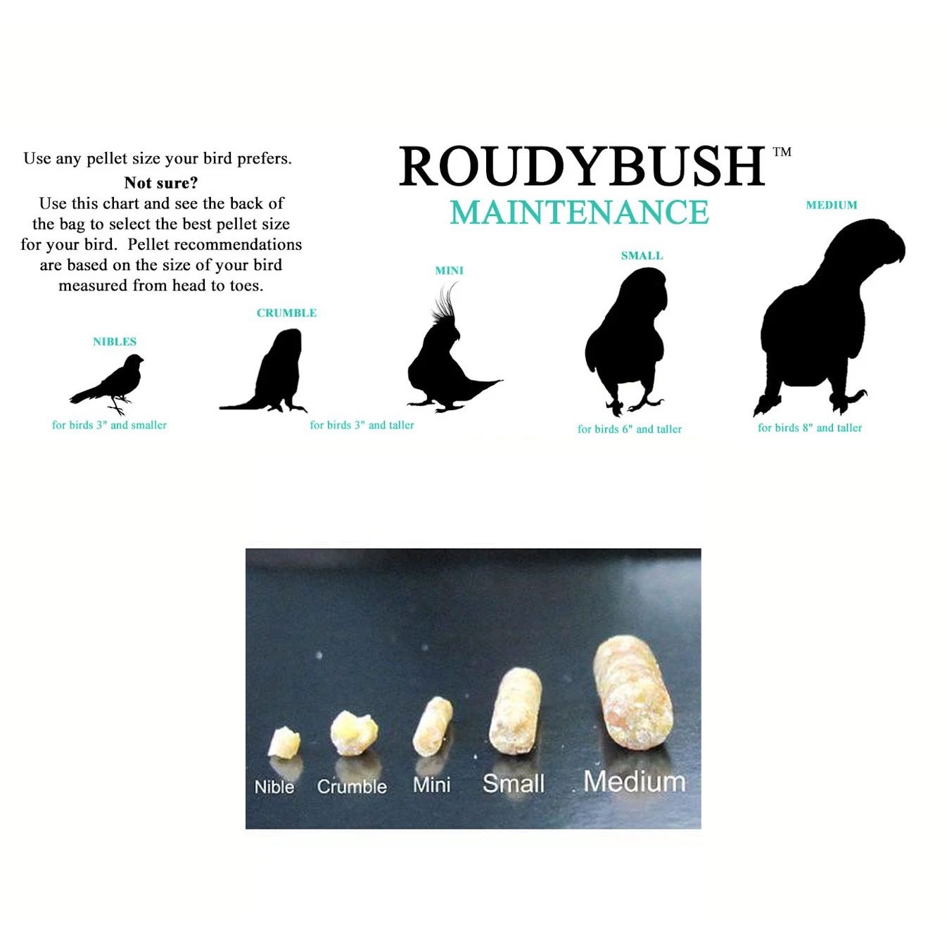 Use this diet when switching your bird from its old diet to Roudybush. Continue to feed to adult birds that are not laying eggs or feeding chicks. Lories and lorikeets, which will accept this diet, will have drier droppings than they have on nectar. If you have a bird that is a chronic egg-layer or a bird with a tendency to develop hypocalcaemia (like African Greys), mix 2/3 Maintenance with 1/3 High-Energy Breeder to supply more calcium and vitamin D3. Do not give additional vitamin or mineral supplements. Fresh fruit and vegetable treats may be given as a minor part of the diet.