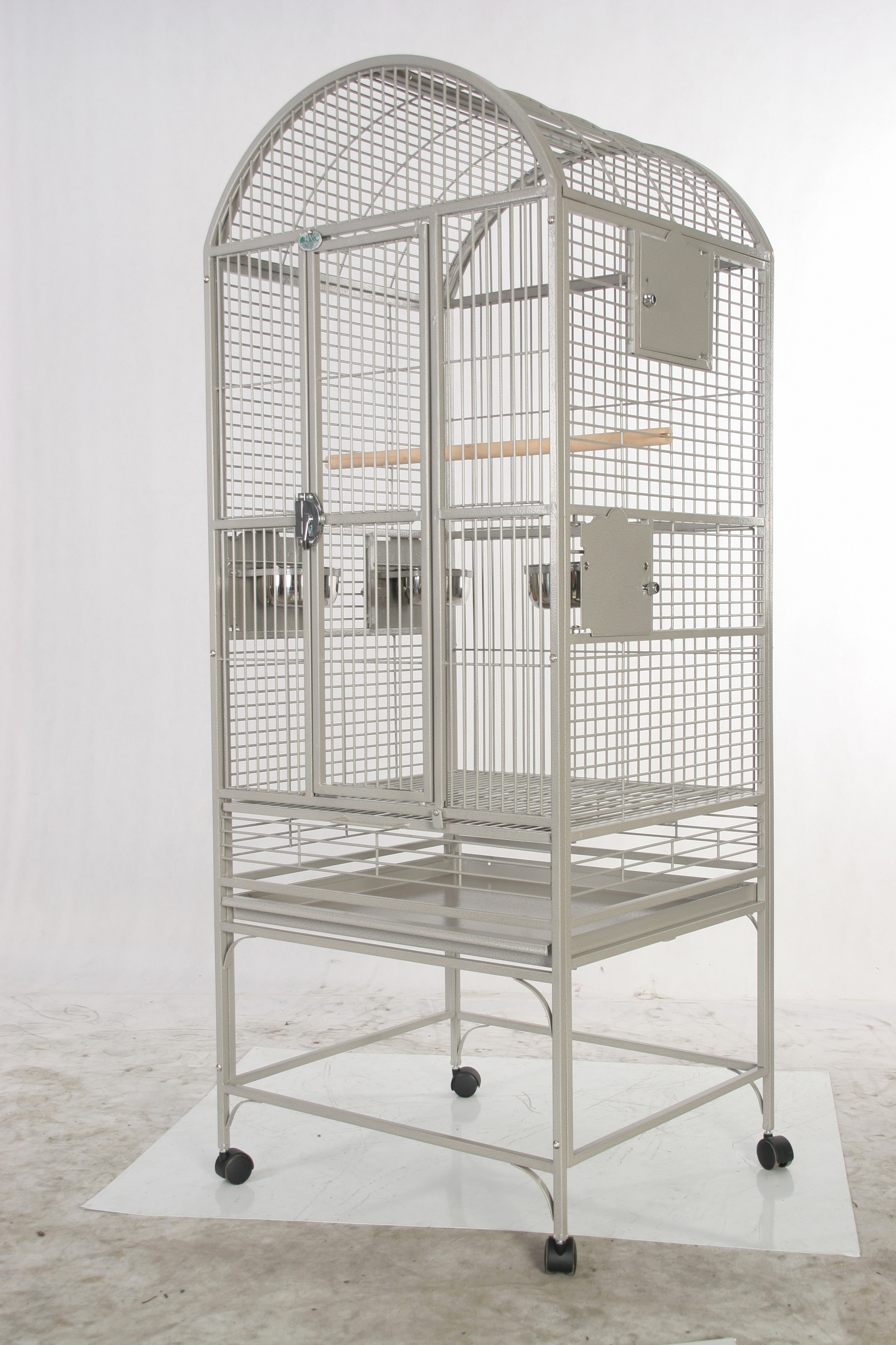 Product Features • Bird proof front door & feeder door locks • Horizontal side bars, vertical bars front & back • 3 swing out feeder doors & addtional breeder box door • 3 stainless steel feeder cups & 2 perches • Large front door for easy access • Removable seed catcher • Slide-out grill & tray for easy cleaning • 4 easy rolling casters • Non-toxic, durable and safe powder coated finish