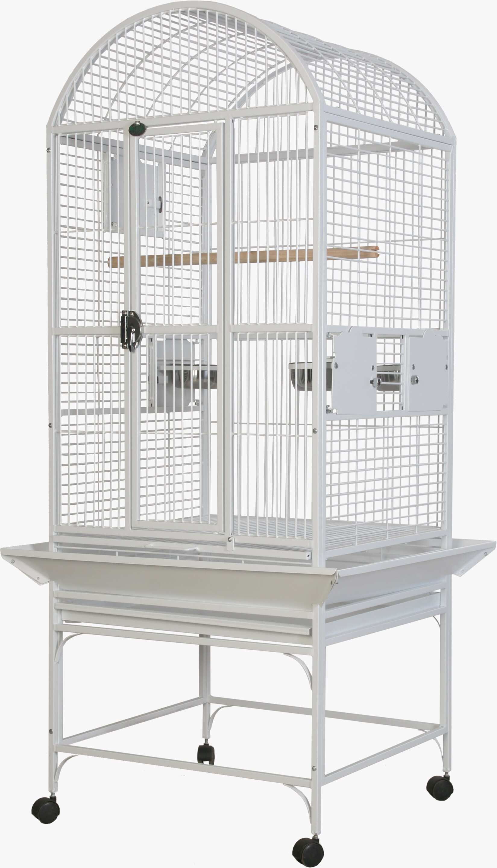 Product Features • Bird proof front door & feeder door locks • Horizontal side bars, vertical bars front & back • 3 swing out feeder doors & addtional breeder box door • 3 stainless steel feeder cups & 2 perches • Large front door for easy access • Removable seed catcher • Slide-out grill & tray for easy cleaning • 4 easy rolling casters • Non-toxic, durable and safe powder coated finish
