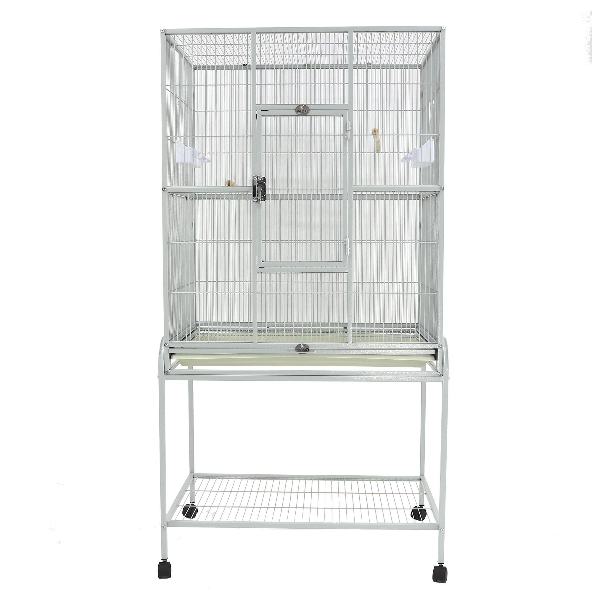 Product Features • Bird proof front door & feeder door locks • Stand included • Vertical bars • Slide-out grill & tray • 2 wood perches & 2 plastic feeder stations • 1 large front door for easy access • 2 feeder doors • 4 easy rolling casters • Bottom shelf for storage • Non-toxic, durable and safe powder coated finish