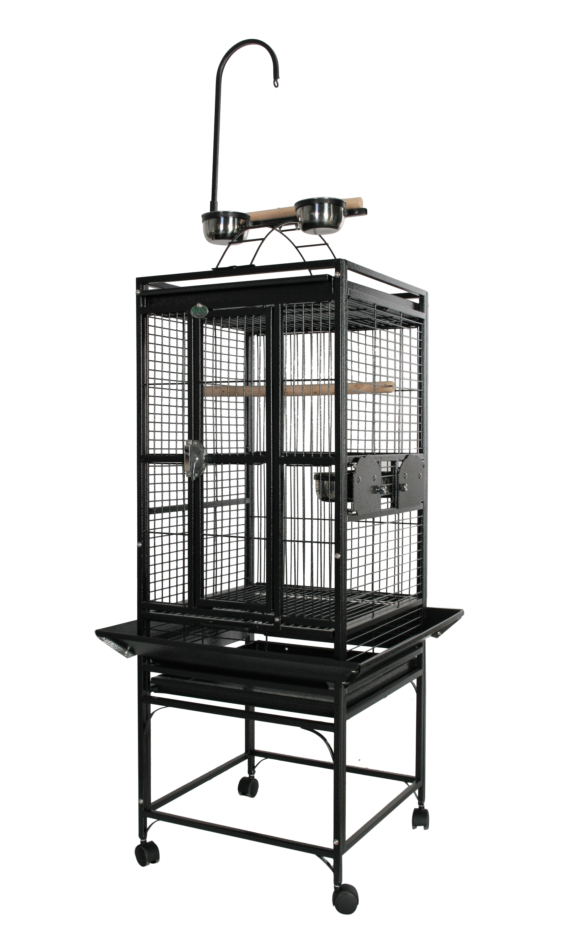 - 2 stainless steel feeder cups & 1 perch