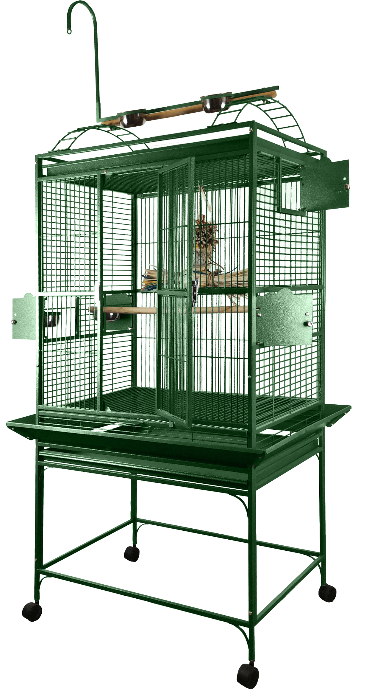 Product Features • Bird proof front door & feeder door locks • Play top with 2 ladders, perch, & toy hook • Horizontal side bars, vertical bars front & back • Front door safety latch • 3 swing out feeder doors • 3 stainless steel feeder cups & perch • Large front door for easy access • Removable seed catcher • Slide-out tray underneath play top keeping cage mess free • Slide-out grill & tray for easy cleaning • Non-toxic, durable and safe powder coated finish