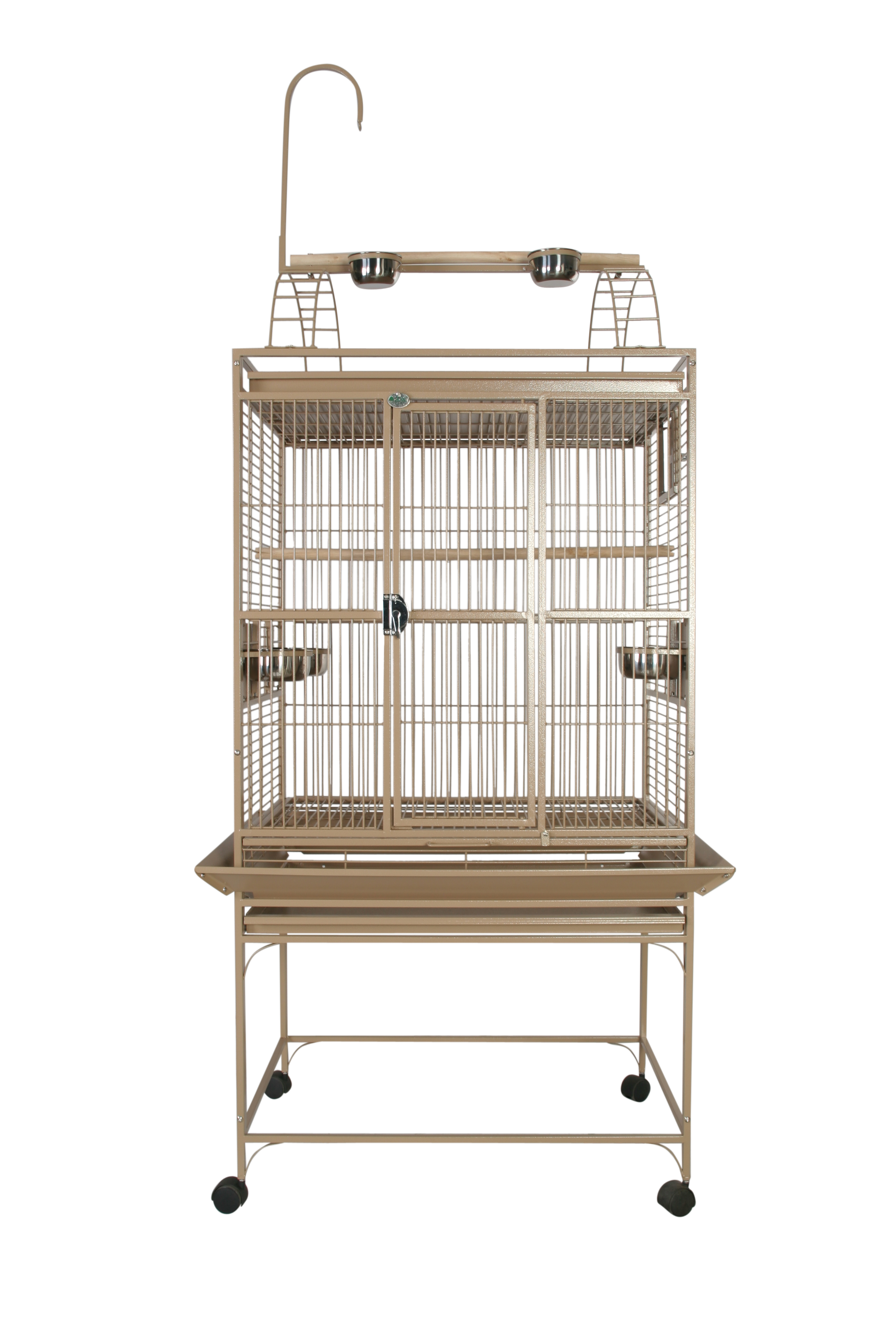 Product Features • Bird proof front door & feeder door locks • Play top with 2 ladders, perch, & toy hook • Horizontal side bars, vertical bars front & back • Front door safety latch • 3 swing out feeder doors • 3 stainless steel feeder cups & perch • Large front door for easy access • Removable seed catcher • Slide-out tray underneath play top keeping cage mess free • Slide-out grill & tray for easy cleaning • Non-toxic, durable and safe powder coated finish