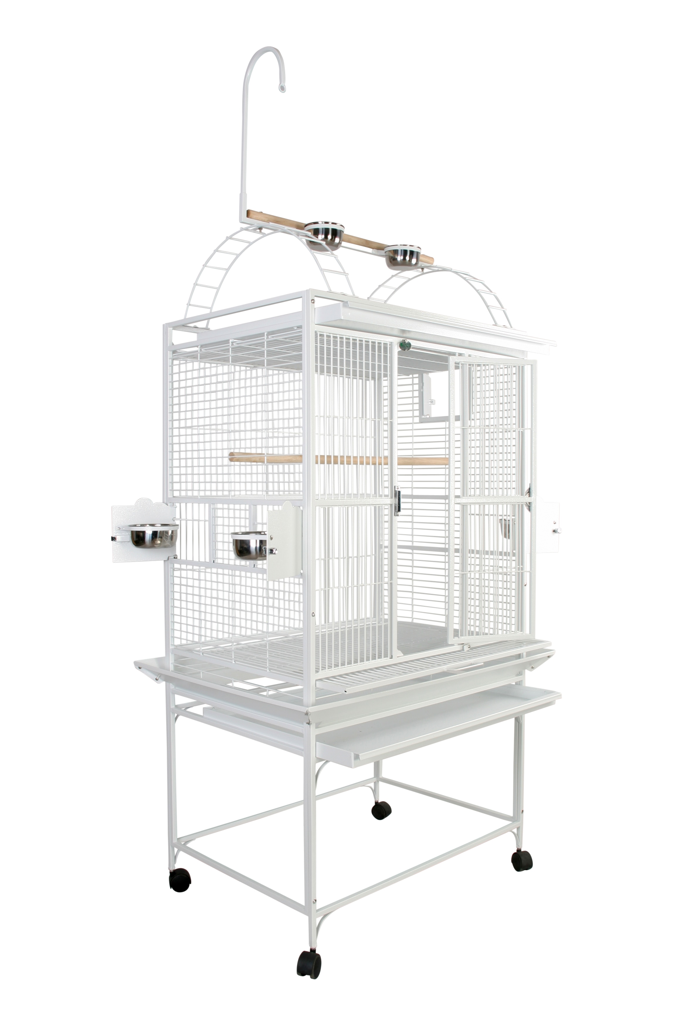Product Features • Bird proof front door & feeder door locks • Play top with 2 ladders, perch, & toy hook • Horizontal side bars, vertical bars front & back • Front door safety latch • 3 swing out feeder doors • 3 stainless steel feeder cups & perch • Large front door for easy access • Removable seed catcher • Slide-out tray underneath play top keeping cage mess free • Slide-out grill & tray for easy cleaning • Non-toxic, durable and safe powder coated finish