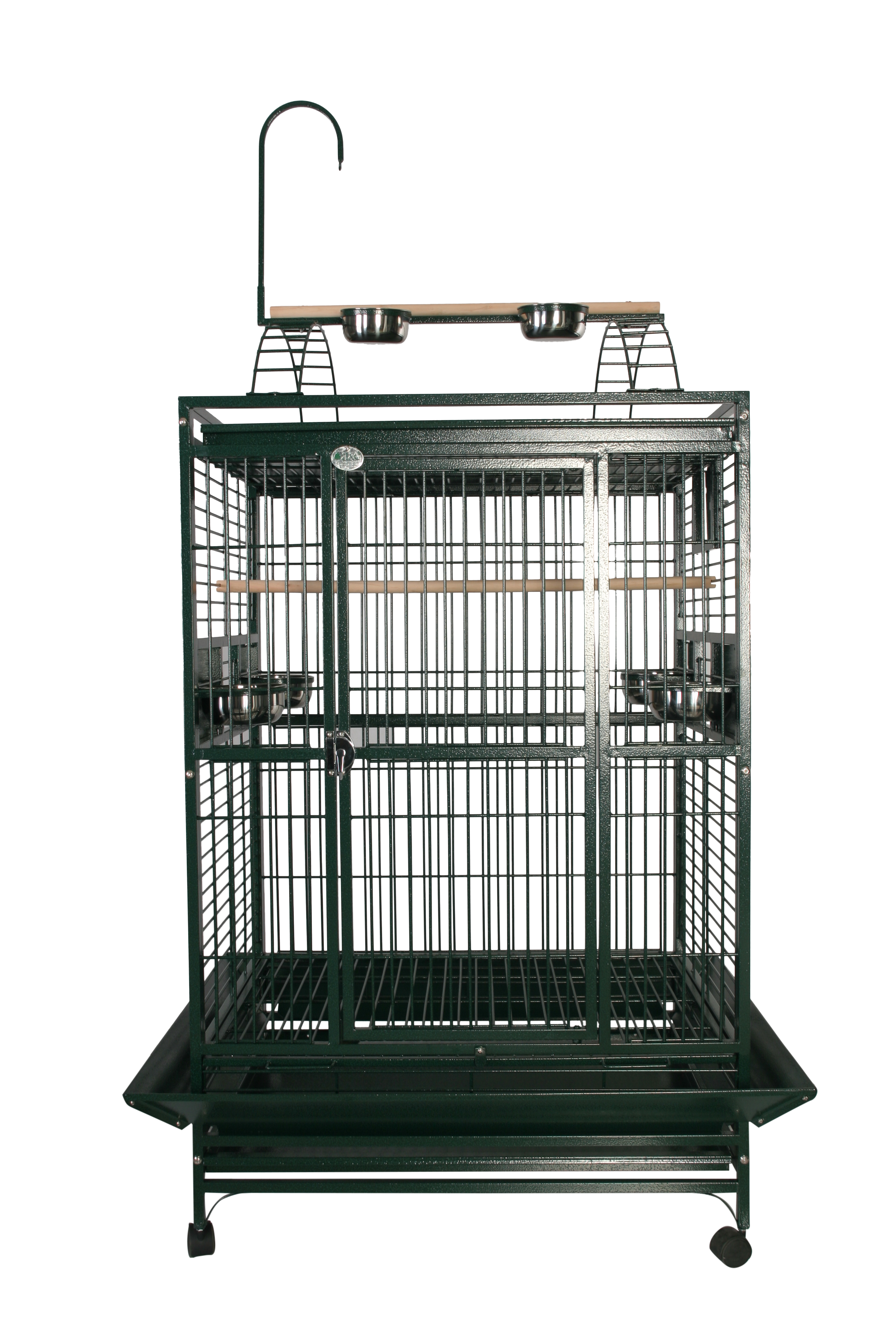 Product Features • Bird proof front door & feeder door locks • Play top with 2 ladders, perch, & toy hook • Horizontal side bars, vertical bars front & back • Front door safety latch • 4 swing out feeder doors • 4 stainless steel feeder cups & perch • Large front door for easy access • Removable seed catcher • Slide-out tray underneath play top keeping cage mess free • Slide-out grill & tray for easy cleaning • Non-toxic, durable and safe powder coated finish