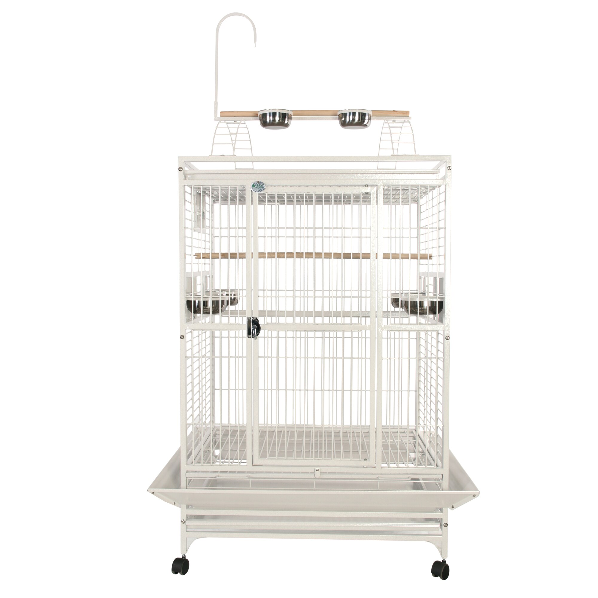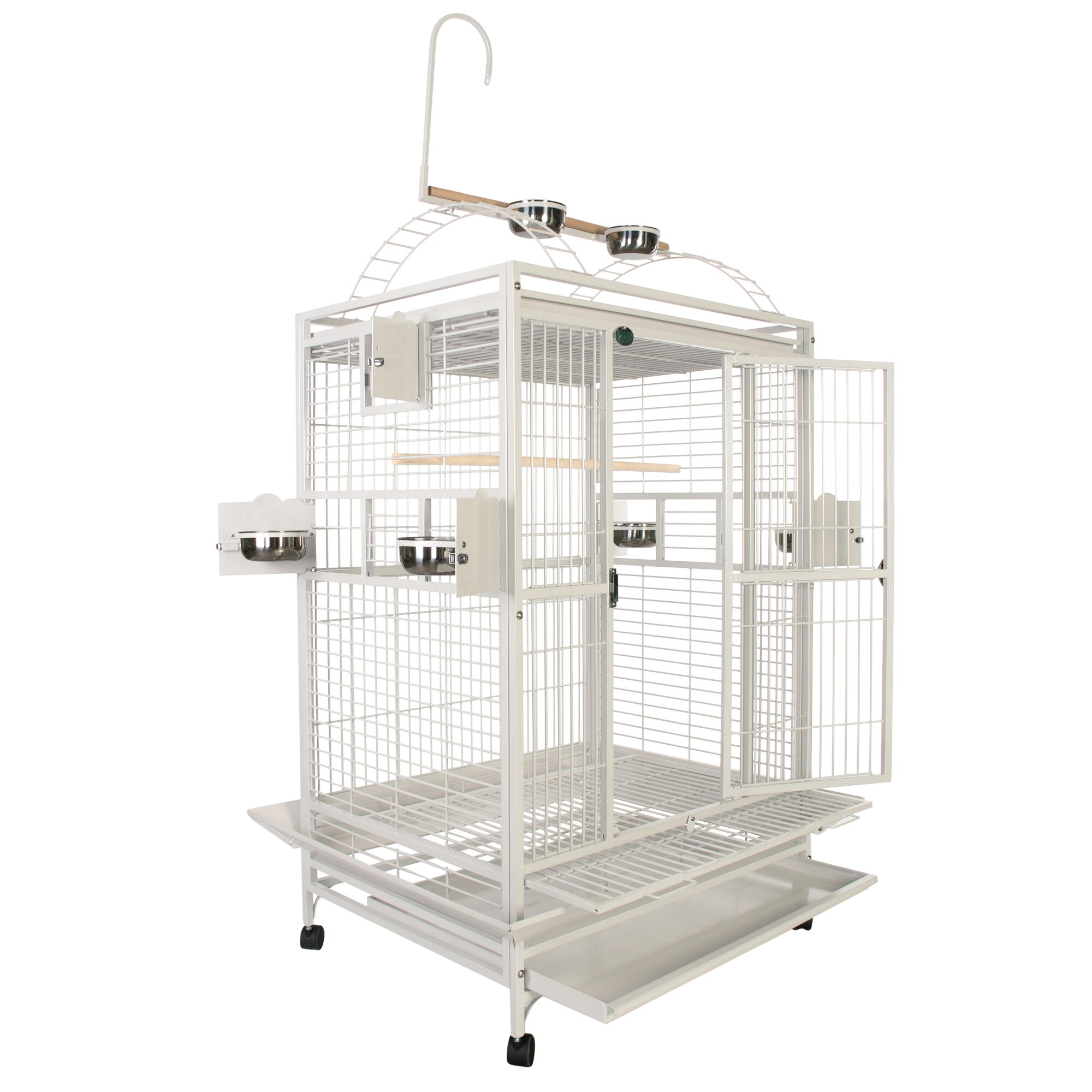 Product Features • Bird proof front door & feeder door locks • Play top with 2 ladders, perch, & toy hook • Horizontal side bars, vertical bars front & back • Front door safety latch • 4 swing out feeder doors • 4 stainless steel feeder cups & perch • Large front door for easy access • Removable seed catcher • Slide-out tray underneath play top keeping cage mess free • Slide-out grill & tray for easy cleaning • Non-toxic, durable and safe powder coated finish